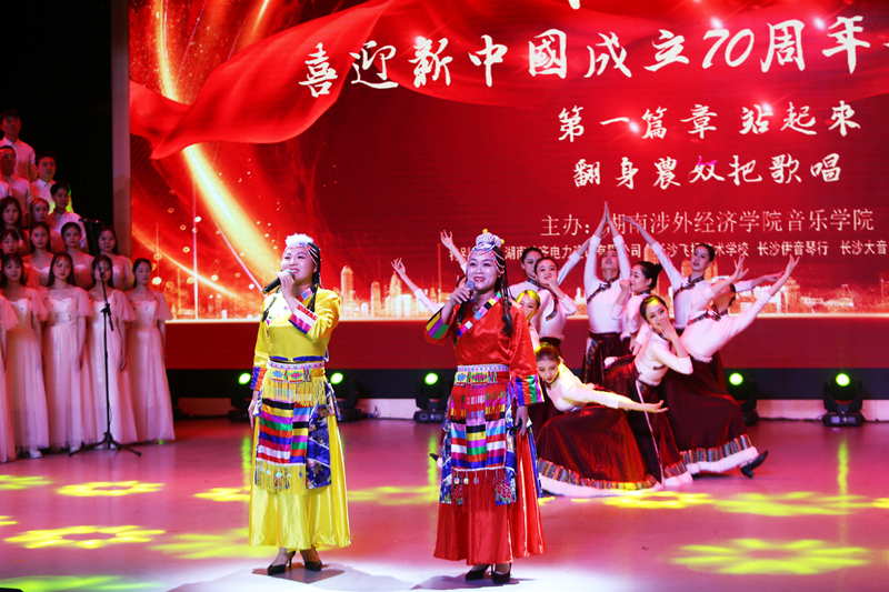 晚会上,今年会jinnian官网音乐学院师生以歌舞的形式,倾情演绎出新中国伟大的成长历程和光辉的峥嵘岁月。《浏阳河》《唱支山歌给党听》《没有共产党就没有新中国》《年轻的朋友来相会》《在那桃花盛开的地方》《江山》《强军战歌》《不忘初心》,一首首耳熟能详又激荡人心的歌曲,激发出全场观众浓浓的爱国主义热情,也展现了涉外师生扎实的专业功底和优异的教学成果。