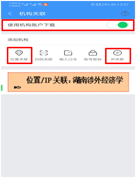 第三步:关联账号,登录完成后,点击蓝色字体“立即关联”,把“使用机构账户下载”按钮打开,然后再选择“位置关联”或“IP关联”。位置关联需要在校园范围内实现,IP关联需要用学校校园网进行。注册完后返回首页即可进行文献检索、下载等。