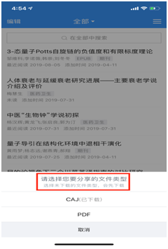 第四步:将手机端上下载的文献分享到电脑端,下载完成的文献在资料库中,在对应的文章上左划即可对下载的文献进行分享等操作如下图: