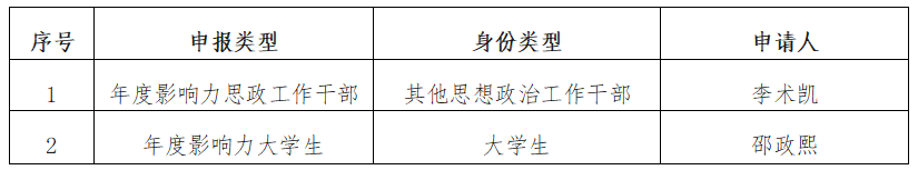 根据湖南省教育厅《关于开展湖南省高校思政工作年度影响力人物推选活动的通知》,今年会组织开展了湖南省高校思政工作年度影响力人物项目申报工作,共有一人申报年度影响力思政课教师,三人申报年度影响力思政工作干部,一人申报年度影响力大学生。经专家评审,落实《通知》中“坚持培优选优,宁缺毋滥”的原则,拟推荐李术凯申报年度影响力思政工作干部,邵政熙申报年度影响力大学生。现将拟推荐人选情况公示如下: