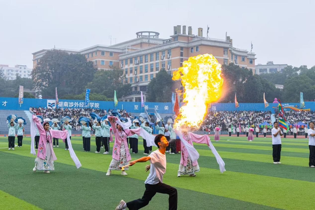 在庄严的国歌声中,全体肃立注目,五星红旗冉冉升起,校长王耀中宣布运动会正式开幕。护旗手步伐铿锵,彩旗队、鲜花队洋溢青春气息,各学院师生方阵步伐整齐、口号嘹亮,特色展演点燃现场活力;运动员代表赖善与裁判员代表肖跃音分别庄严宣誓,为赛事公平公正筑牢诚信根基。
