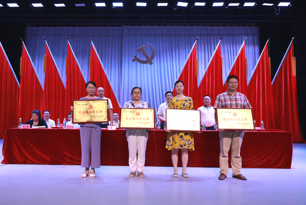 随后,校党委委员、鞠晨曦副校长宣读校党委《关于表彰2017-2018学年度先进基层党组织、优秀共产党员和优秀党务工作者的决定》。该《决定》指出,为庆祝我党成立97周年,深入学习贯彻习近平新时代中国特色社会主义思想和党的十九大精神,提升基层党组织的凝聚力和战斗力,增强广大师生党员的归属感、使命感和荣誉感,引导激励广大师生党员践行新担当、展现新作为,校党委决定对商学院等2个党总支,第七直属党支部等4个教工党支部,机械工程学院第一学生党支部等6个学生党支部(含学生宿舍活动党支部),以及陈奇等157名优秀党员和许梦龙等22名优秀党务工作者予以表彰,希望受表彰的先进集体和个人珍惜荣誉,再接再厉,取得更优异的成绩,希望全体党员师生以先进为榜样,在各自岗位上为学校的发展建设作出更大贡献。鞠晨曦还宣读了校党校《关于表彰第39期入党积极分子培训优秀组织奖、优秀教员、优秀学员的决定》。在主席台就坐的校党委委员为获奖集体颁奖。