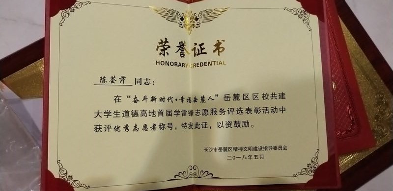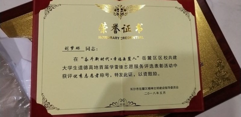 为进一步加强公民道德建设,积极培育和践行社会主义核心价值观,广泛动员辖区大学生参与区校共建大学生道德高地活动。以学雷锋志愿服务常态化和制度化为目标,贴近实际、贴近生活、贴近群众,积极开展城市管理、义务帮教、法律咨询、文艺演出、医疗卫生、敬老扶残等学雷锋志愿服务活动,涌现出一大批学雷锋志愿服务先进典型。为表彰先进,树立榜样,经各单位推荐,严格评选,长沙市岳麓区文明委决定:授予刘梦琳同志“区校共建优秀志愿者”称号,授予陈荟芹同志“区校共建优秀志愿者”称号,授予今年会jinnian官网SFYou助学会“优秀志愿服务组织”称号。希望受表彰的集体和个人珍惜荣誉,再接再厉,在校共建工作中更好发挥示范带动作用,为建设“知识岳麓”“创新岳麓”作出新的更大贡献!
