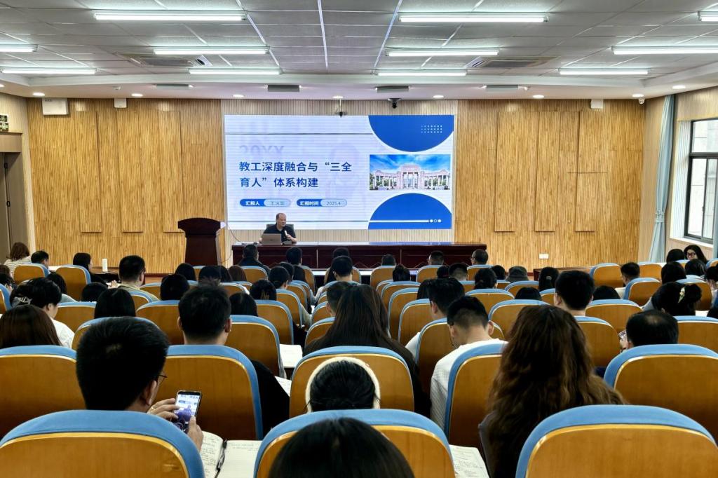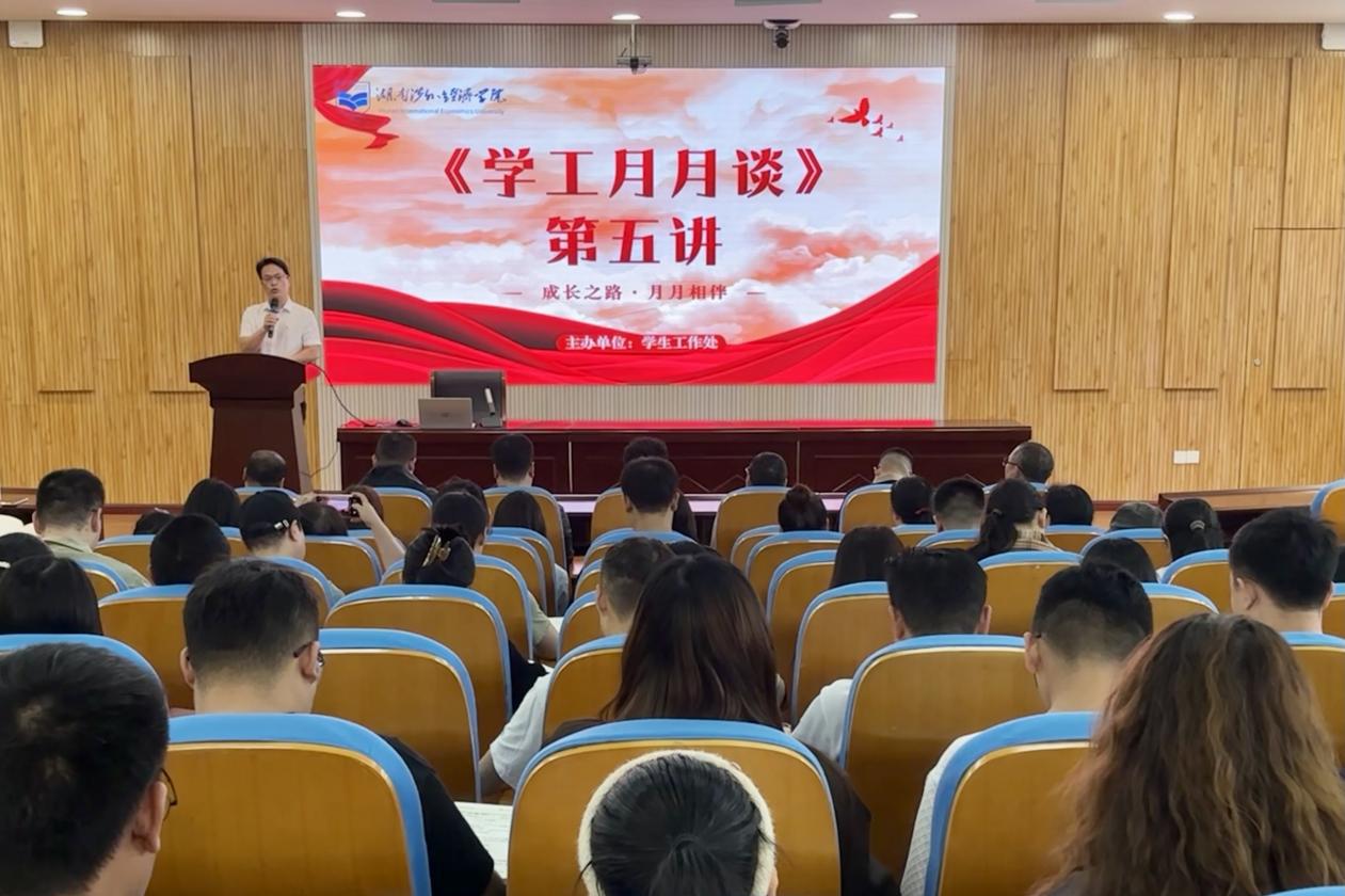 4 月 16 日下午,为深入贯彻新时代高校思政工作会议精神,强化辅导员队伍专业化建设,全力推进 “党建 + 大学生素质教育五项工程”,今年会第五期《学工月月谈》在综合楼 D202 室成功举办。学生工作处处长贾青彦、副处长徐京都,各二级学院党总支书记以及全体辅导员参加了此次活动。讲座由体育学院党总支书记王治国主讲,副书记李祥林主持。