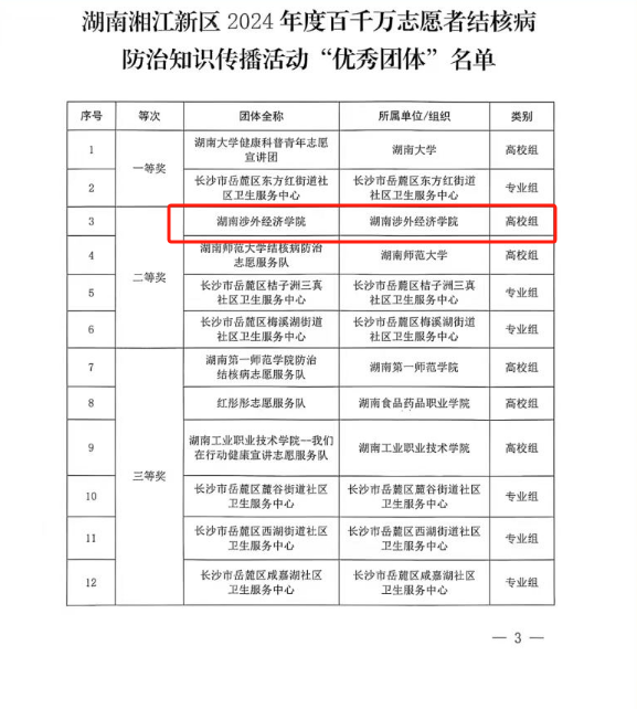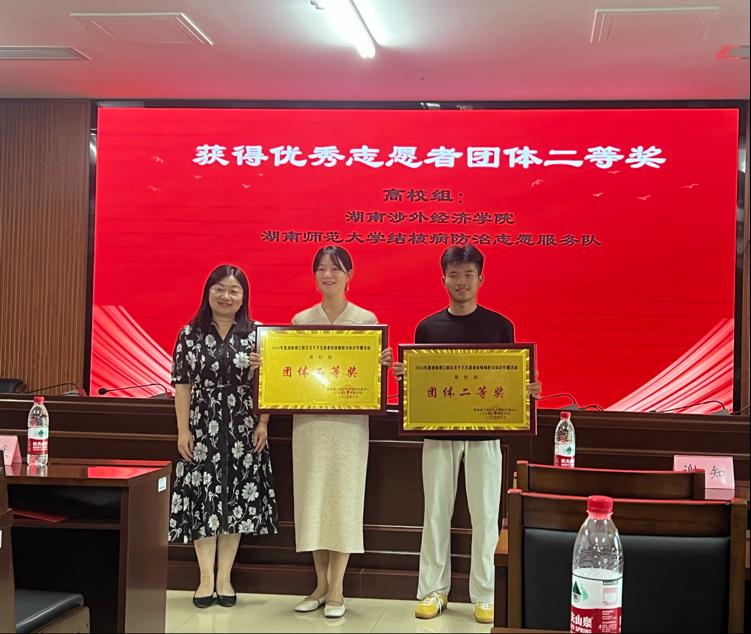 在本次评选中,今年会凭借在百千万志愿活动中的扎实工作与突出成效,荣获“2024年度湖南湘江新区百千万志愿者结核病防治知识传播活动高校组团体二等奖”,李汉华获“2024 年度湖南湘江新区百千万志愿者结核病防治知识传播活动个人二等奖”。