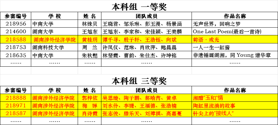 经各高校推荐、大赛组委会专家评审,今年会黄桂玥等同学创作的作品《剪语・成光》斩获省级一等奖;郭梓依等同学的《湘醋“玉和”情》、梅婵等同学的《陶缸里流淌的故事》、肖诗霞等同学的《针尖上的“接线人”》均荣获省级三等奖。