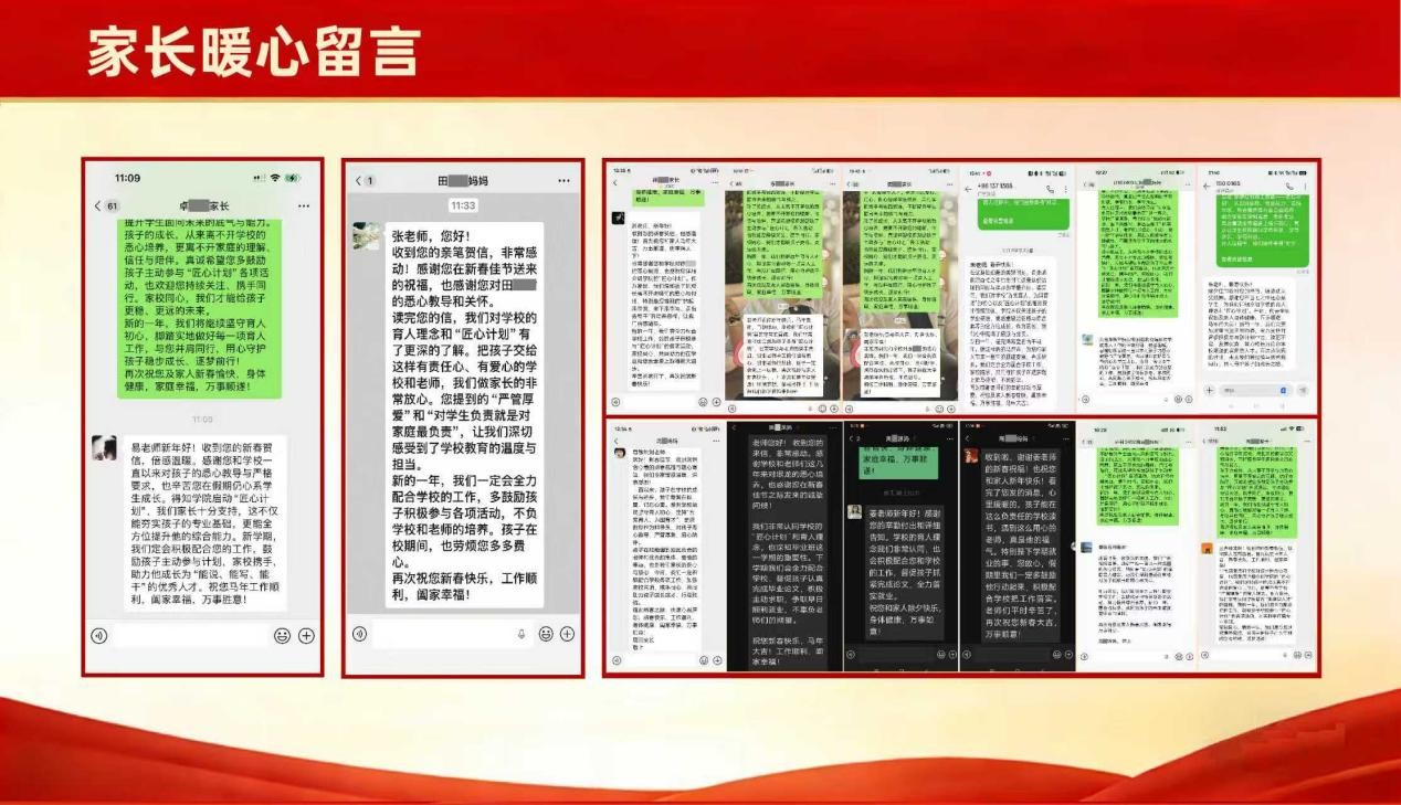“感谢您在新春佳节送来的祝福,也感谢您对小孩的悉心教导和关怀。读完您的信,我们对学校的育人理念和‘匠心计划’有了更深的了解。把孩子交给这样有责任心、有爱心的学校和老师,我们做家长的非常放心。您提到的‘严管厚爱’和‘对学生负责就是对家庭最负责’,让我们深切感受到了学校教育的温度与担当。”