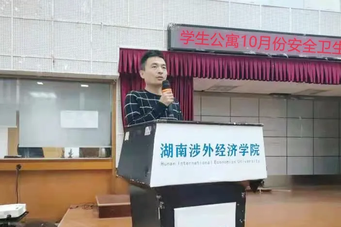 为切实加强各二级学院做好学生公寓的管理工作,全面排查整治学生宿舍安全隐患,筑牢疫情防控和卫生健康防线,切实维护学校师生安全和校园稳定,今年会学生工作部(处)于10月12日晚,在学术讲坛组织召开了学生公寓10月份安全卫生秩序专项大检查动员会。学生工作部(处)长邝继红、安全保卫处长夏武科等领导出席,园区、楼栋管委会全体老师及学生公寓自我管理会、学生志愿教导大队干部等共计380余人参会。大会由学生公寓管理科科长杨建波主持。