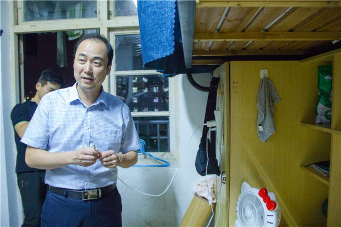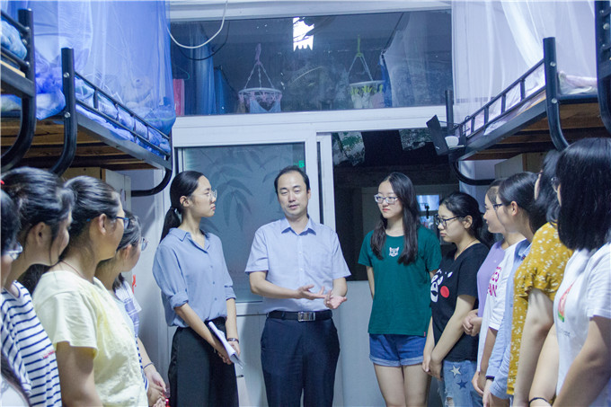乔静与辅导员吴辉、陈祥云等2018级新生辅导员来到各新生寝室,亲切地询问他们的家乡,并送来了中秋问候。乔静说,同学们不远百里,千里,甚至如新疆学子的万里,来到师大地旅学院学习,是对学校办学的认可,也是正确的选择,并代表学院欢迎大家的到来。
