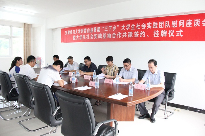 本网讯(地旅学院 李雯、陈健)7月24日下午,副校长彭凤莲在地旅学院院长苏勤、院党委副书记乔静及地旅学院教授、博士生导师程先富的陪同下,来到皖西大别山深处的霍山县水土保持试验站,亲切慰问地旅学院赴皖西大别山地区生态环境综合调研团队全体队员。霍山县副县长纪昌国,水务局局长王才品,水务局党组成员、县农建办主任汪文,上土士镇镇长何林,霍山县水土保持试验站站长汪军红等同志热情接待彭凤莲一行,并举行安徽师范大学赴霍山县暑期“三下乡”大学生社会实践团队慰问座谈会暨大学生社会实践基地合作共建签约、挂牌仪式。活动由霍山县水务局党组成员、县农建办主任汪文主持。