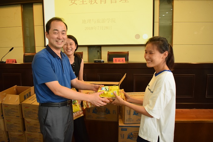 本网讯(地旅学院 王美)骄阳似火,烈日炎炎,为做好暑期留校学生的安全教育管理和2018届考研学生的服务工作,7月28日下午,地旅学院在院实验楼101教室召开暑期留校学生安全教育暨2018届考研学生慰问会。学院党委书记贾冠忠、院长苏勤、党委副书记乔静,毕业班辅导员以及全体考研学生参加了会议。会议由院党委副书记乔静主持。