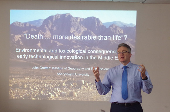 John Grattan介绍了中东7000年前对于铜矿的开发和提炼带来的严重污染,即使在3000年前已停止这种开采方式,但当时的污染至今依然存在并产生影响,通过植物生长实验来研究中东地区早期科技革命的环境及毒物学影响,从而反映环境污染治理的重要性及现实意义。John Grattan主要对古代Faynan地区的铜矿开采遗迹、工厂遗址以及在沙漠旷野过游牧生活的阿拉伯人的生活环境进行了挖掘探究,经过对地区动植物、人类尸骨以及阿拉伯人生活用品和食物中的重金属元素检测,证实了千年前铜矿开采及提炼对环境的污染和对人类健康的严重危害,而通过长时间的生物体内积累,造成了当地人严重的生理缺陷,如不孕、畸形等。