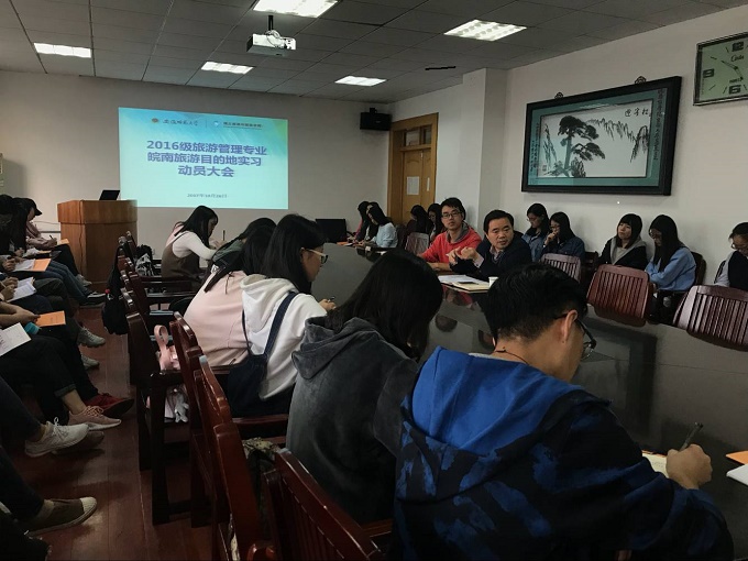 为确保实习工作的顺利开展,学院于10月26日下午在行政楼三楼会议室举行皖南旅游目的地实习动员大会暨专题培训。副院长王朝辉、专业教师王群、辅导员吴辉以及全体2016级旅游管理专业学生参加了本次大会。