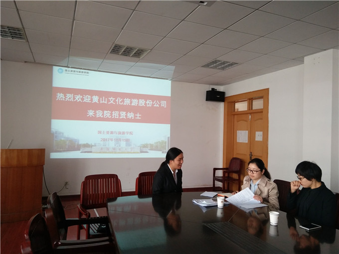 本网讯(国旅学院 韦银艳)11月14日,国旅学院"职海扬帆"系列招聘之黄山文化旅游股份公司专场招聘会于行政楼三楼会议室举办。黄山文旅黎阳in巷项目总经理贺晓侠、酒店项目负责人裴俊和2008级旅游管理专业校友周玲(人事负责人)亲自来永利官网组织宣讲和面试,三十余位毕业班学生参加此次招聘会。