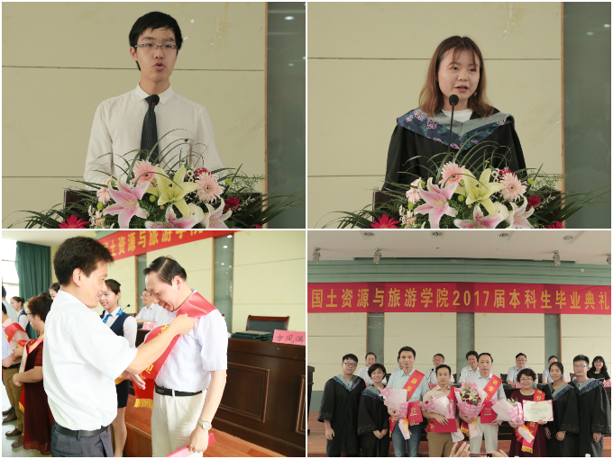 毕业班辅导员陈健、吴辉先后回顾本届毕业生大学生涯的点滴,送上毕业寄语,祝福毕业生未来一帆风顺、前程似锦,带着梦想扬帆起航。仲夏别离季,师生情意重。两位辅导员在发言过程中几度哽咽落泪。2015级旅游管理专业梁宜人代表非毕业班学生致欢送辞,感谢学长学姐们在学习、生活和工作上的倾情帮助,祝愿学长学姐们一帆风顺、生活幸福。2013级地理科学专业赵丹丹作为毕业生代表致答谢辞,一起怀念美好的大学时光,感激老师的殷殷教诲。表达了踏上新征程的信心、对美好校园生活的不舍和对母校深深的祝愿。