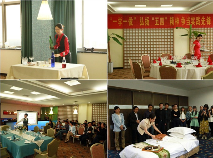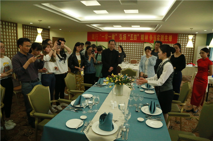 本网讯(国旅学院 徐童彤)5月3日下午5点,国旅学院于学院实验楼三楼实训室开展了主题为“践行‘一学一做’ 弘扬‘五四’精神 争当实践先锋”的团日活动暨酒店管理专业技能展演活动。院党委副书记乔静,副院长王朝辉,酒店管理专业负责人杨兴柱及专业教师和辅导员代表,相关专业青年学生代表参加了此次活动。