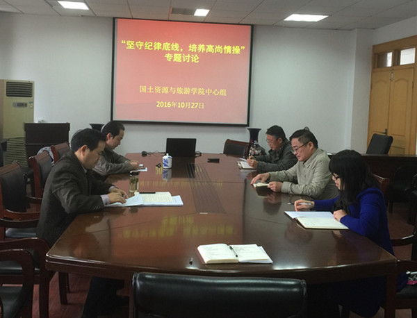 本网讯 (国旅学院)10月27日下午,国旅学院党委中心组开展“两学一做”学习教育第三专题学习讨论,围绕“坚守纪律底线,培养高尚情操”专题开展学习讨论,学院党委委员、院领导班子同志参加了学习交流,院党委书记贾冠忠主持会议。