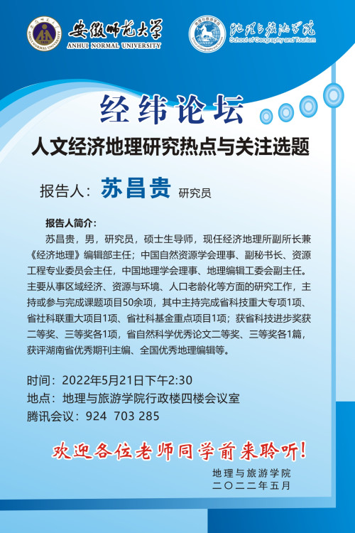 【学术预告】苏昌贵: 人文经济地理研究热点与关注选题