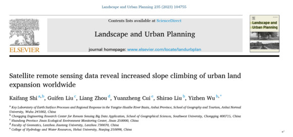 近日,永利官网施开放副教授研究小组联合西南大学、兰州交通大学、河海大学等多家科研单位在城市研究领域旗舰型期刊《Landscape and Urban Planning》(SSCI/SCI双检索,城市研究领域排名第一,中科院一区Top,IF=8.119)发表题为Satellite remote sensing data reveal increased slope climbing of urban land expansion worldwide的研究论文。施开放为论文的第一作者,安徽师范大学为论文的第一完成单位。