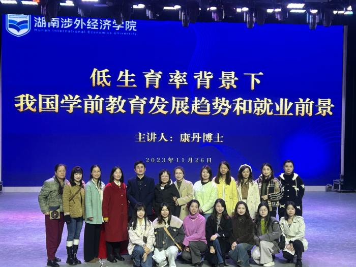 11月26日,今年会音乐学院举办的第五届“魅力涉外”文化艺术节活动迎来了第三场讲座。本次讲座由湖南师范大学康丹博士以“低生育率背景下我国学前教育发展趋势和就业前景”为主题进行主讲,音乐学院学前教育系主任沈建军主持,学前教育系全体师生参与。
