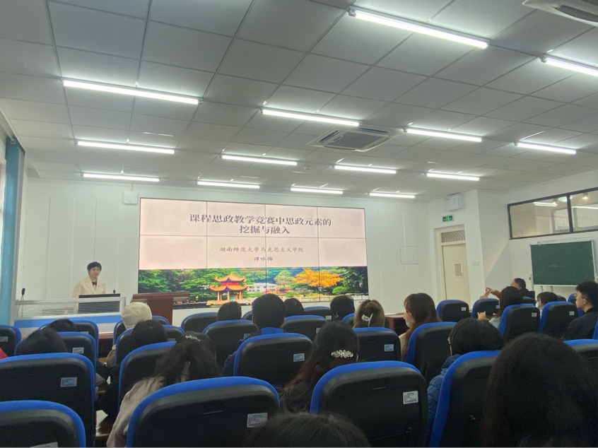 为深入贯彻落实教育部印发的《高等学校课程思政建设指导纲要》,围绕“培养什么人、怎样培养人、为谁培养人”的根本问题,把思想政治教育贯穿人才培养体系和全面推进高校课程思政建设,发挥好每门课程的育人作用。马克思主义学院于11月30日下午在新综合楼C315主办专题培训。本次培训主题为“课程思政教学竞赛中思政元素的挖掘与融入”,邀请湖南师范大学马克思主义学院马克思主义基本原理系主任谭咏梅教授主讲,讲座面向全校所有专业教师,由马克思主义学院院长周仲秋主持。