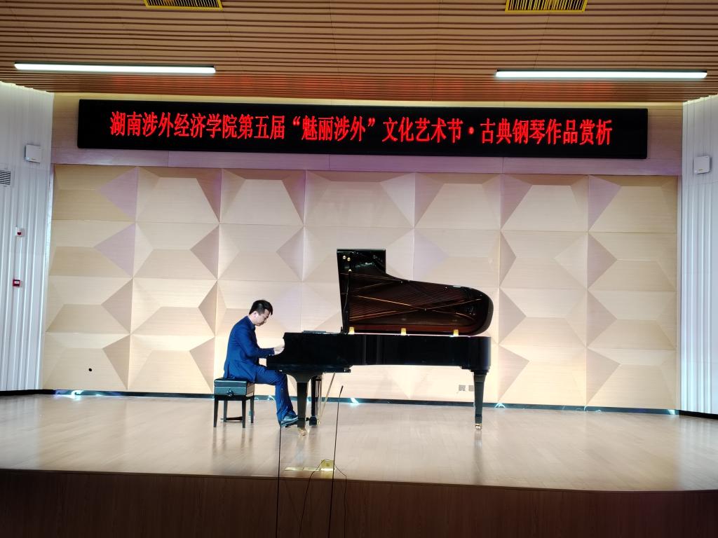 2023年12月7日晚,第五届“魅丽涉外”文化艺术节系列讲座之“古典钢琴作品赏析”在综合实训楼原声音乐厅举行,此次讲座特邀克拉拉、舒曼国际钢琴大赛青年组冠军,德归钢琴演奏家赵俊主讲。
