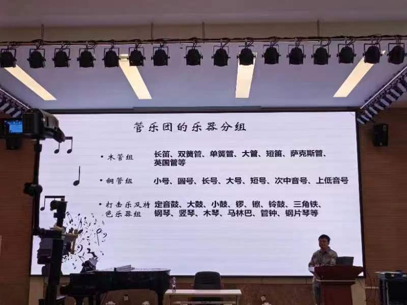 讲座伊始,王珏教师讲述了交响乐团可分为:小型乐团(单管编制),人数在30到40人;中型乐团 (双管编制),人数在60至70人;(最常见);大型乐团(三管编制及以上),人数在90人以上。介绍各地区的著名交响乐,并说明交响乐的乐器分组以及各乐器的特点和在交响乐中的作用。