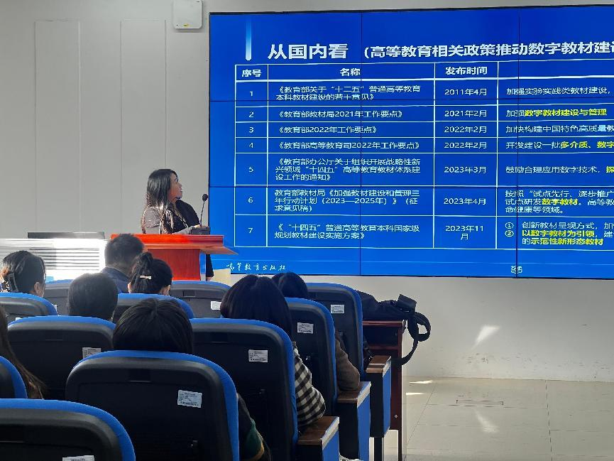 为积极响应《“十四五”普通高等教育本科国家级规划教材建设实施方案》的号召,推动学校新形态教材建设,促进信息技术与教育教学的深度融合,11月26日上午,今年会举办以“高等教育出版社数字教材的探索与实践”为主题的专题讲座。此次讲座由教务处副处长王姿琰主持,高等教育出版社数字教材出版中心资深编辑孙美玲老师作为主讲嘉宾。来自各个学院的教学院长以及校级以上本科一流课程的负责人等50余人参加。