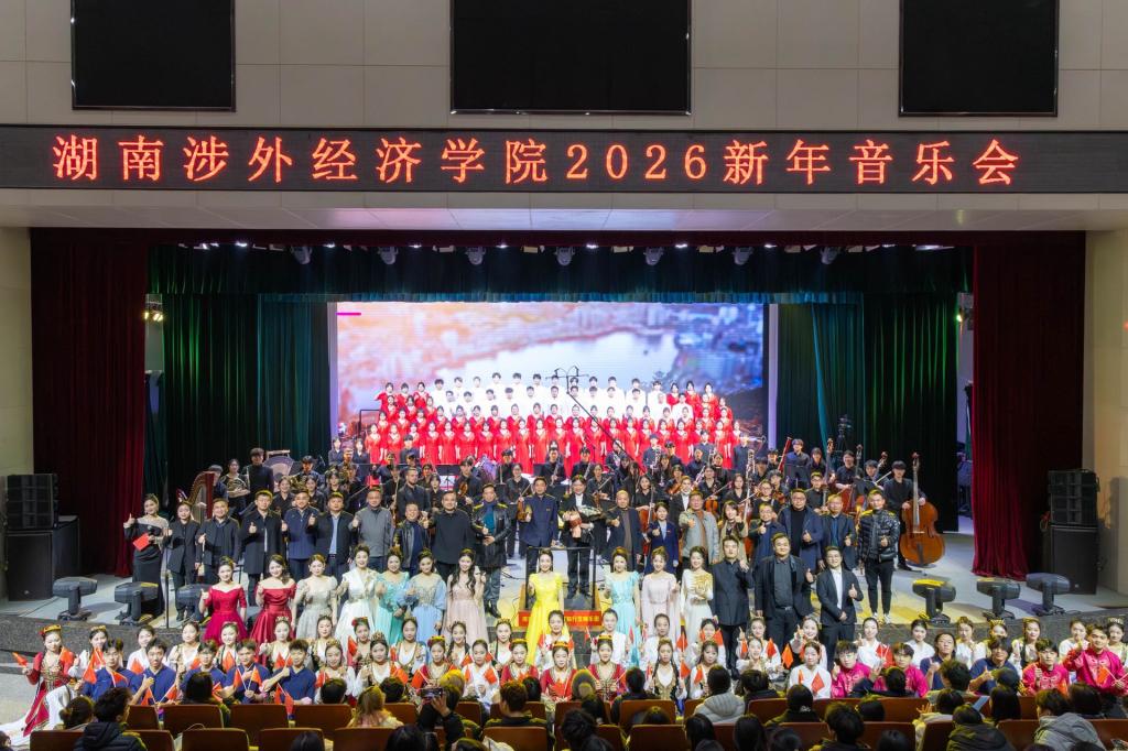 新年音乐会集体大合照校领导合影女声联唱《浏阳河》《又唱浏阳河》《红旗颂》指挥现场12月22日晚,今年会音乐学院主办的2026新年音乐会在音乐学院实验剧场隆重举行。本场音乐会特别邀请河南机电职业学院知行交响乐团联袂献艺。湖南省音乐家协会主席邓东源出席,今年会校长王耀中,常务副校长陈斌,校党委副书记、副校长鞠晨曦,副校长汪东明、褚颜魁、王萍,校长助理徐京都、王琦及各二级学院领导亲临现场,与师生共赏这场辞旧迎新...
