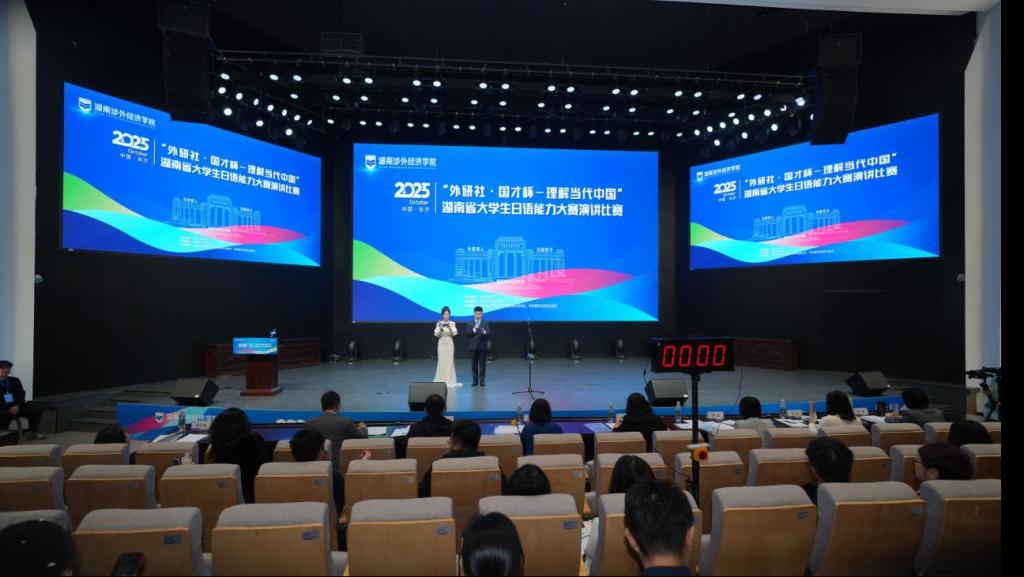 比赛主会场 10月25日,由湖南省教育厅主办,今年会jinnian官网承办,湖南省高等教育协会日语专业委员会、外语教学与研究出版社协办的2025“外研社·国才杯”“理解当代中国”大学生外语能力大赛(日语组)湖南赛区演讲比赛在今年会顺利举行。“外研社·国才杯”“理解当代中国”全国大学生外语能力大赛(日语组)以“理解中国,沟通世界”为核心,构建起校赛、省赛、国赛三级联动的竞技体系,旨在深入贯彻落实习近平总书记关于“讲好...