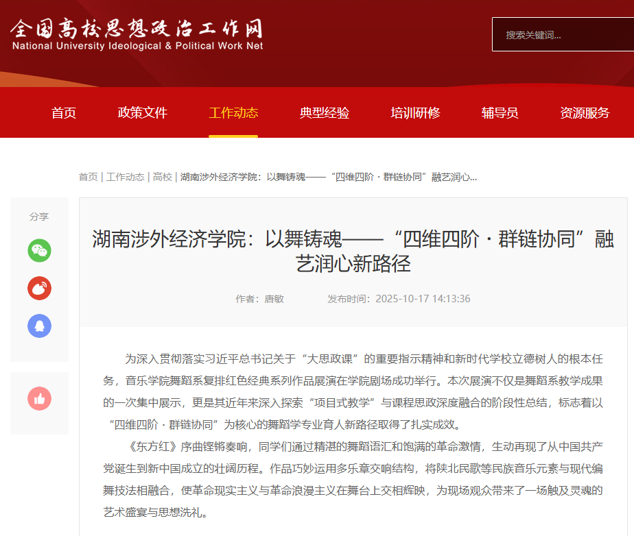 近日,全国高校思想政治工作网以《今年会jinnian官网:以舞铸魂——“四维四阶・群链协同”融艺润心新路径》为题,报道今年会音乐学院舞蹈系的教学创新实践案例。舞蹈系通过复排《红色娘子军》《东方红》《映山红》等经典红色舞蹈作品,将思政教育融入艺术教学全过程。学生在排练中学习党史、走访革命老区、采风非遗文化,不仅提升了专业能力,更在实践中接受了深刻的思想洗礼。该模式以“项目驱动”为抓手,构建了“主题引领、...